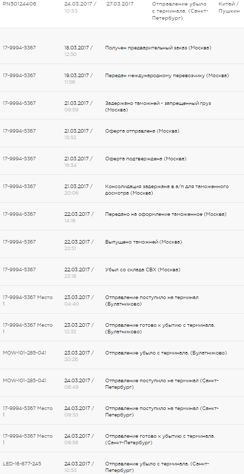 Не связывайтесь с этой компанией, название говорит само за себя, быстрее только пони, заказывал телефон с Алиэкспресс 13.03.2017, оно по факту только 18 числа был получен предварительный заказ, в итоге 24 убыло с терминала (Санкт-Петербург) в 10:53, доставка до города Пушкин. Потом начал им звонить в районе 12 часов дня, мне сказали что отправление поступит на терминал только в 17.00 в город Гатчина. Вы не могли ещё дальше отправить, отправили тогда бы сразу на луну чего уж там! В итоге получаем крайне не качественное обслуживание, хамоватые работники и очень медленную доставку, никогда больше не выберу эту доставку!